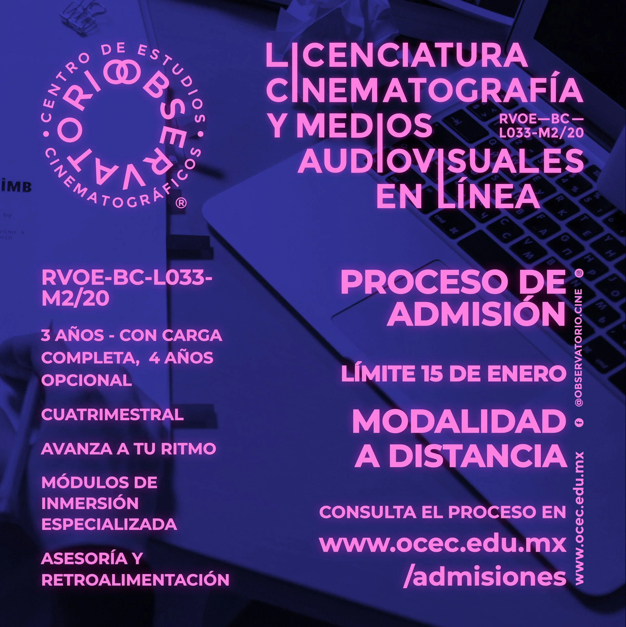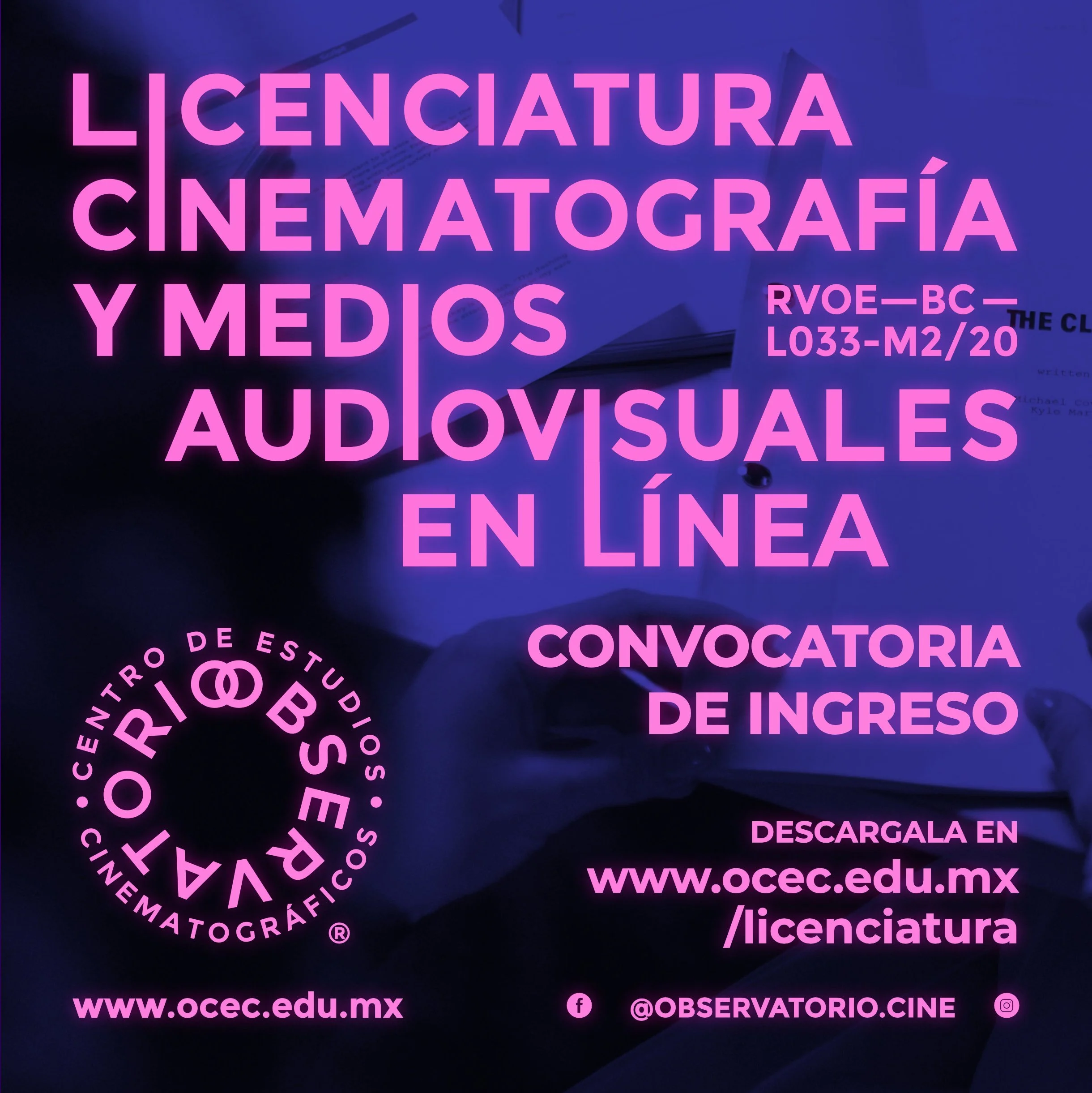 ✅ - Examen de Admisión (sin costo) se realiza por medio de nuestra plataforma www.observatoriocine.online Tienes que crear un usuario y una vez creado te daremos acceso al examen en línea, confirma tu registro enviando un correo a info@ocec.edu.mx o mensaje de WhatsApp (el número lo puedes encontrar en el pie de página de esta página), posteriormente te aparecerá el examen en la plataforma.